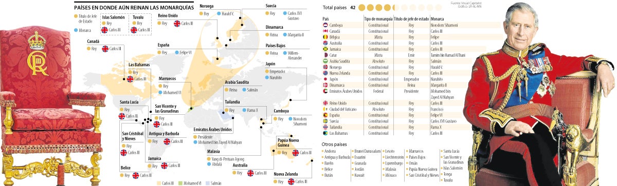 Casi 70 años después las calles de Londres vuelven a tener una coronación, pero es aún más curioso que luego de tanto tiempo y con avances marcados a nivel cultural, económico o tecnológico, en 42 países siguen sobresaliendo los sistemas monárquicos como el de Carlos III.