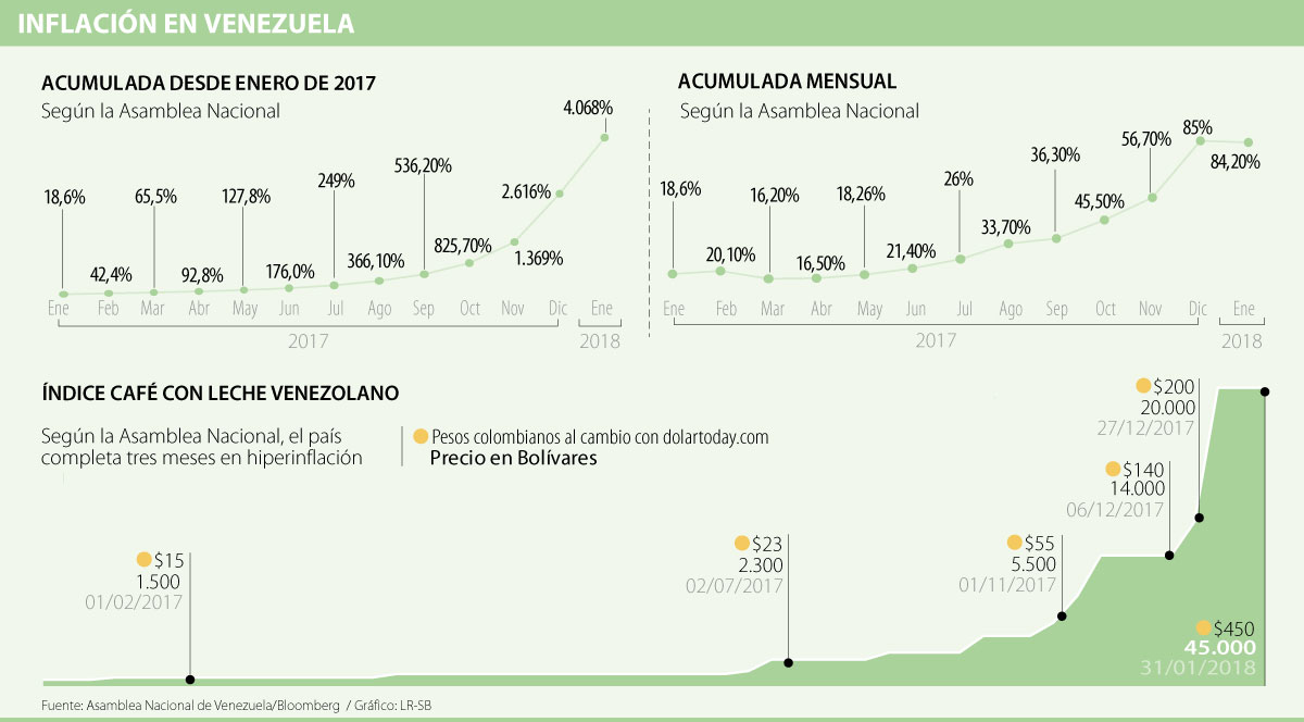 Si se toma como referencia la conversión a pesos que está en el portal dolartoday.com, que mide el mercado paralelo en ese país, una taza de esta bebida en una pastelería al este de Caracas pasó de 20.000 bolívares ($200) a 45.000 bolívares ($450) entre diciembre de 2017 y enero.