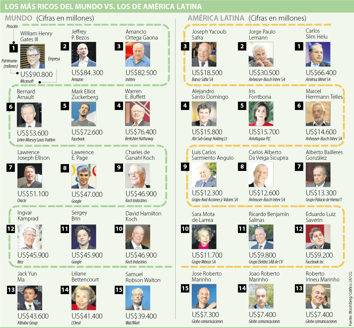 Las fortunas de los tres empresarios más ricos del mundo, según el Índice de Bloomberg, es incluso superior al patrimonio de los 15 multimillonarios con más dinero de América Latina, en donde se encuentran personajes como Carlos Slim, Jorge Paulo Lemann y Joseph Yacoub Safra, entre otros, que juntos dan como resultado un patrimonio de US$252.500 millones, luego de haberle sumado en el último año US$48.132 millones.