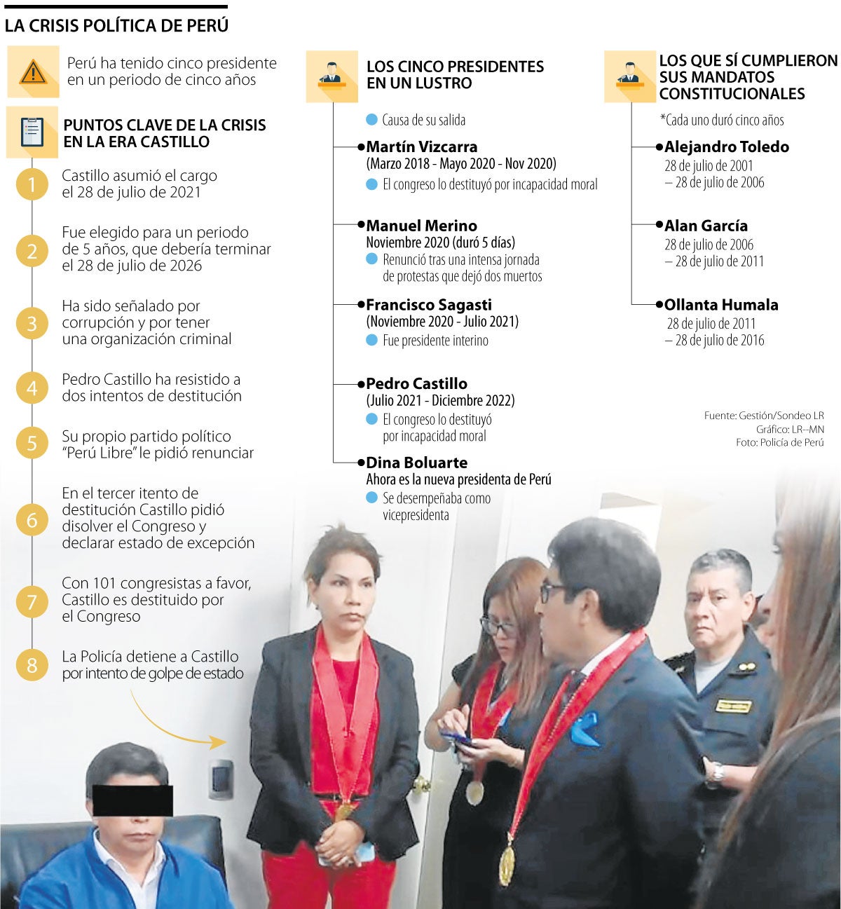 Pedro Castillo fue destituido por el congreso y detenido por la policía luego de un golpe de estado fallido. Ahora Dina Boluarte asume como nueva mandataria
