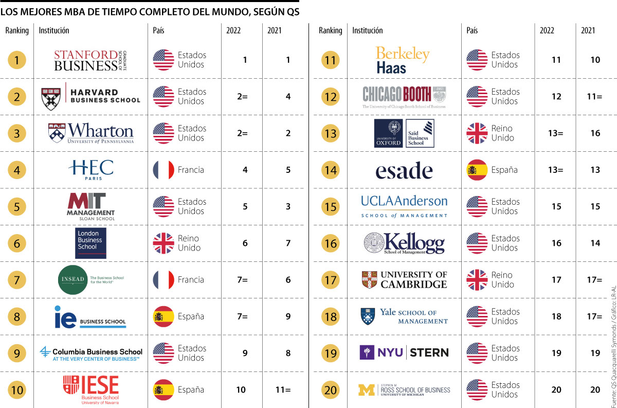 La firma QS Quacquarelli Symonds publicó la actualización para 2022 de su QS World University Ranking: Global Full-Time MBA, en el que se presentan las mejores escuelas de negocios del mundo para estudiar una maestría en administración de empresas.