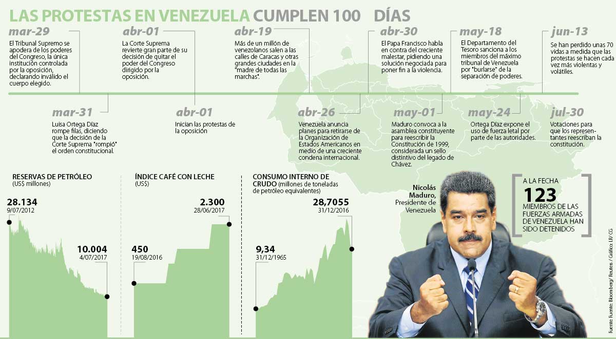 Hoy se cumplen 100 días de las protestas convocadas por la oposición venezolana contra el gobierno de Nicolás Maduro. Desde el inicio de esas marchas hasta la fecha, la inflación venezolana ha llegado a 175%, según datos obtenidos a través del índice café con leche de Bloomberg, que mide el valor que tiene una taza de este producto diariamente.