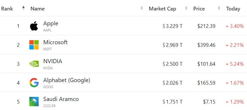 Por efecto del lunes negro, Microsoft e Nvidia que cerraron la semana pasada con capitalización arriba de US$3 billones, hoy caen de ese nivel, la única que se mantiene es Apple con US$3,2 billones.