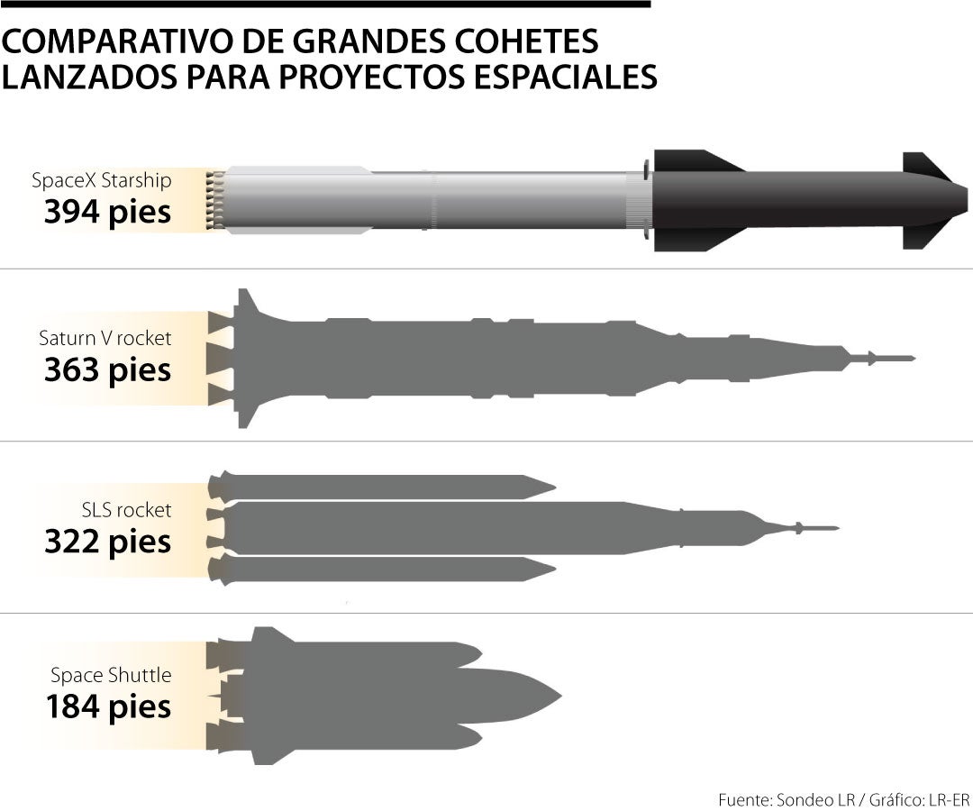 Con una altura aproximada de 394 pies (120 metros), Starship es un gigante, más grande que el cohete Saturno V que llevó a los astronautas a la luna en las décadas de 1960 y 1970 y que el Sistema de Lanzamiento Espacial de la Nasa que realizó su primer vuelo de prueba en noviembre.
