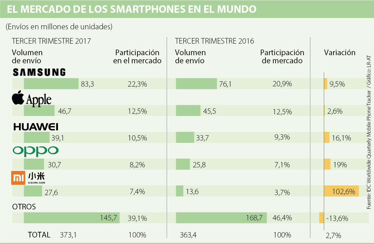 Los resultados de IDC muestran que Samsung y Apple continúan siendo los líderes del mercado, seguidos de tres marcas chinas: Huawei, Oppo y Xiaomi. Estas tres últimas se llevan 42,8% de los envíos del top cinco, que para el tercer trimestre alcanzaron los 227,4 millones de teléfonos inteligentes. Si se suman los 145,7 millones de envíos de las otras marcas, se tiene un total de envíos de 373,1 millones de celulares.