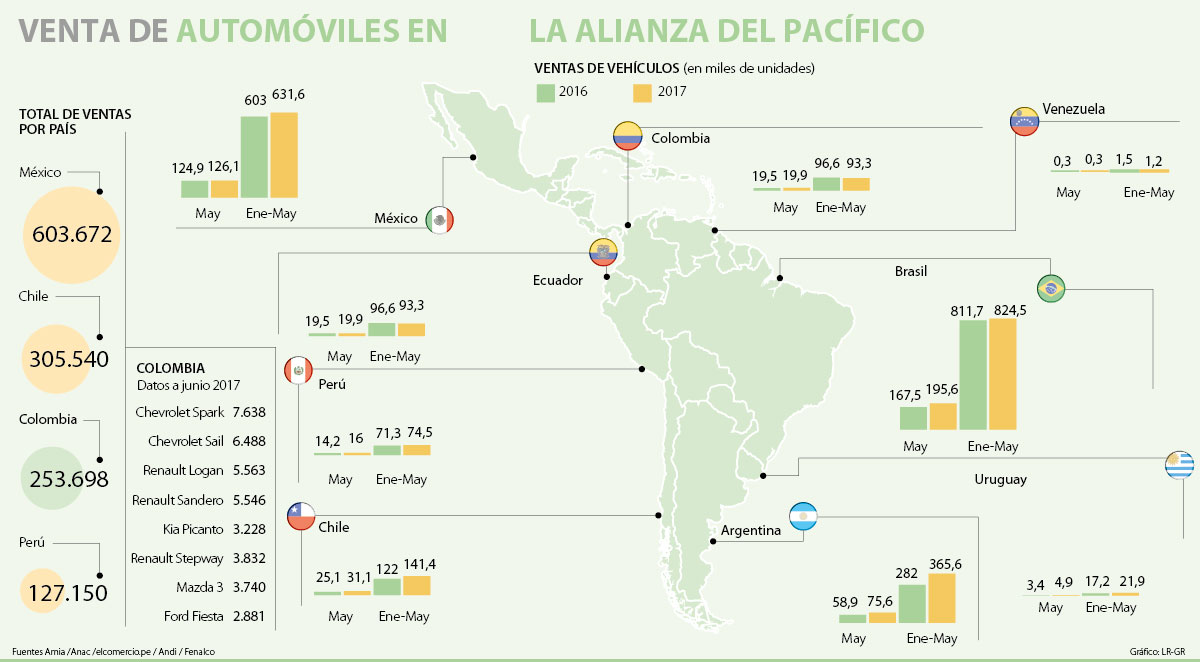 En total, los países que conforman la Alianza del Pacífico (AP) vendieron alrededor de 1,2 millones de vehículos de diversas marcas el año pasado. Según los datos presentados por las autoridades pertinentes, México con 603.672 unidades vendió el doble de vehículos que Colombia (253.698).