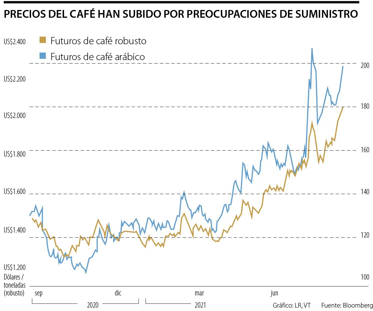 El contrato de noviembre subió un 0,4% para cerrar a US$2.026 la tonelada en Londres, el acuerdo más alto para un contrato más activo desde septiembre de 2017. En el mes, el precio subió más del 13%, la mayor cantidad desde principios de 2014. Eso está aumentando el costo. perspectivas para las empresas que utilizan los frijoles, como las marcas Nescafé de Nestlé SA.