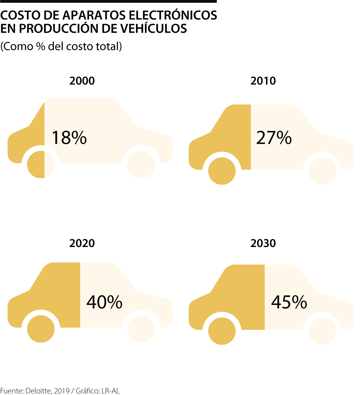 Actualmente, para producir un carro se requieren entre 30 y 50 chips. Según cálculos de Deloitte, el peso de los componentes electrónicos de los vehículos ha venido ganando terreno. Mientras para el año 2000 solo 18% de los costos de producción estaban asociados a dichos componentes, hoy estos representan 40% de su valor.