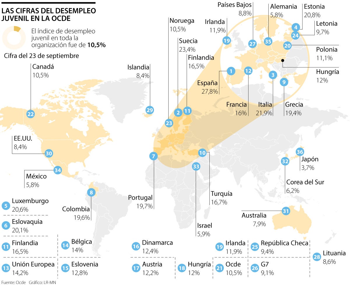 Países como España con 27,8%, Suecia con 23,4% e Italia con 21,9% tienen la tasa más alta de desempleo juvenil entre los países miembros del organismo.
