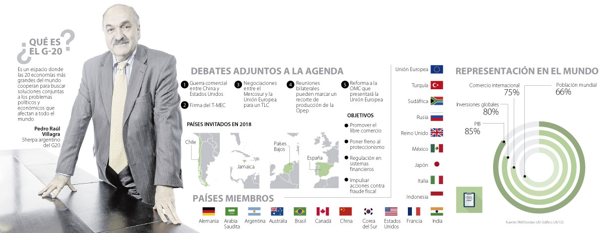 Los focos girarán en torno a la firma del T-MEC, la guerra comercial y hasta los avances para un tratado entre el Mercosur y la Unión Europea. Muchos de estos asuntos no están estrictamente ligados a la agenda oficial, sino que utilizarán el escenario del G20 como plataforma de resolución. Así lo destacó en diálogo con LR el sherpa del Gobierno de Argentina, Pedro Raúl Villagra, cuyo rol se centra en asesorar al líder de su país y negociar en su nombre, además de coordinar la política de la cumbre en general.