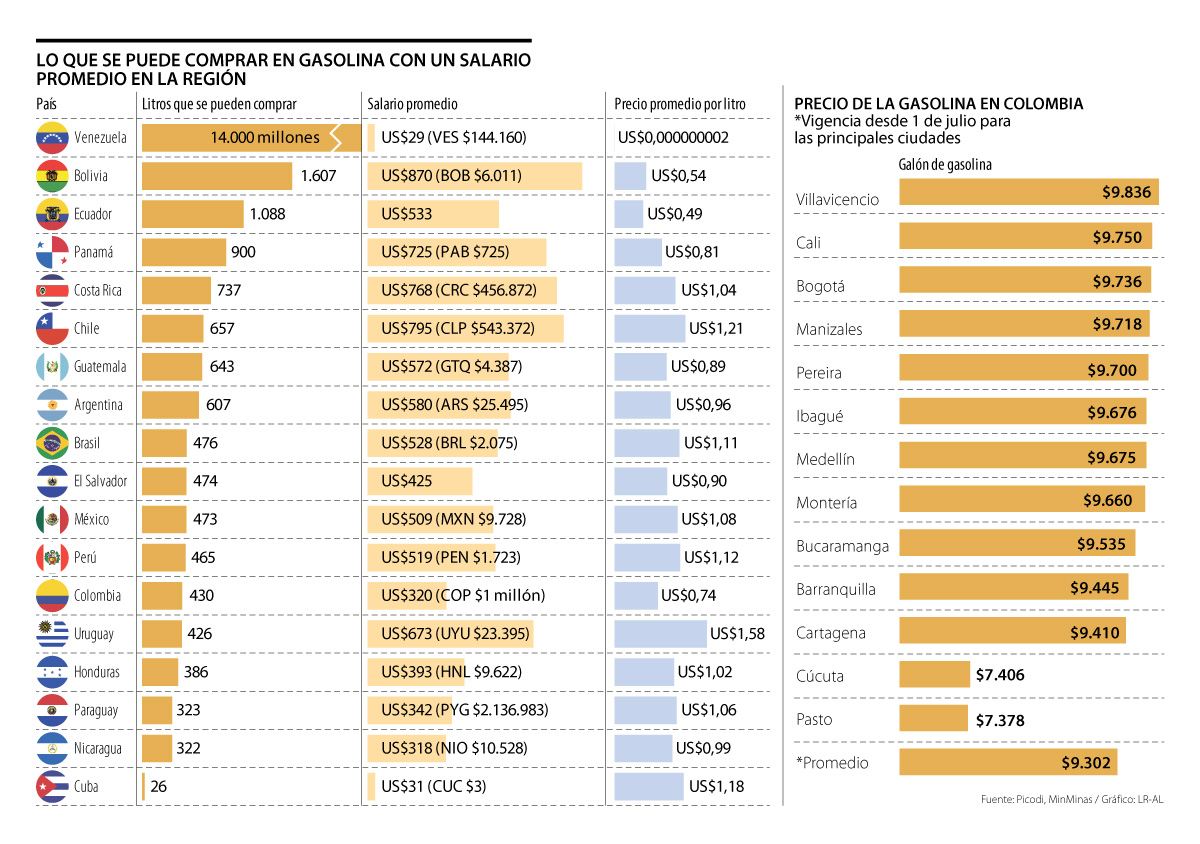 De acuerdo con los datos del portal Picodi, Venezuela, a pesar de contar con el salario promedio más bajo (US$29 mensuales) es el país en el que más litros de gasolina se pueden comprar con el trabajo de un mes. La razón para que esto se dé en un país tradicionalmente petrolero corresponde a que si bien el sueldo es muy bajo comparado con los del resto de América, el costo del litro de gasolina es aún más bajo, proporcionalmente frente a las demás economías. El costo del litro de gasolina sería de tan solo US$0,000000002, lo que llevaría a que un salario tan bajo como el presentado como promedio fuera suficiente para comprar más de 14.000 millones de litros del combustible.