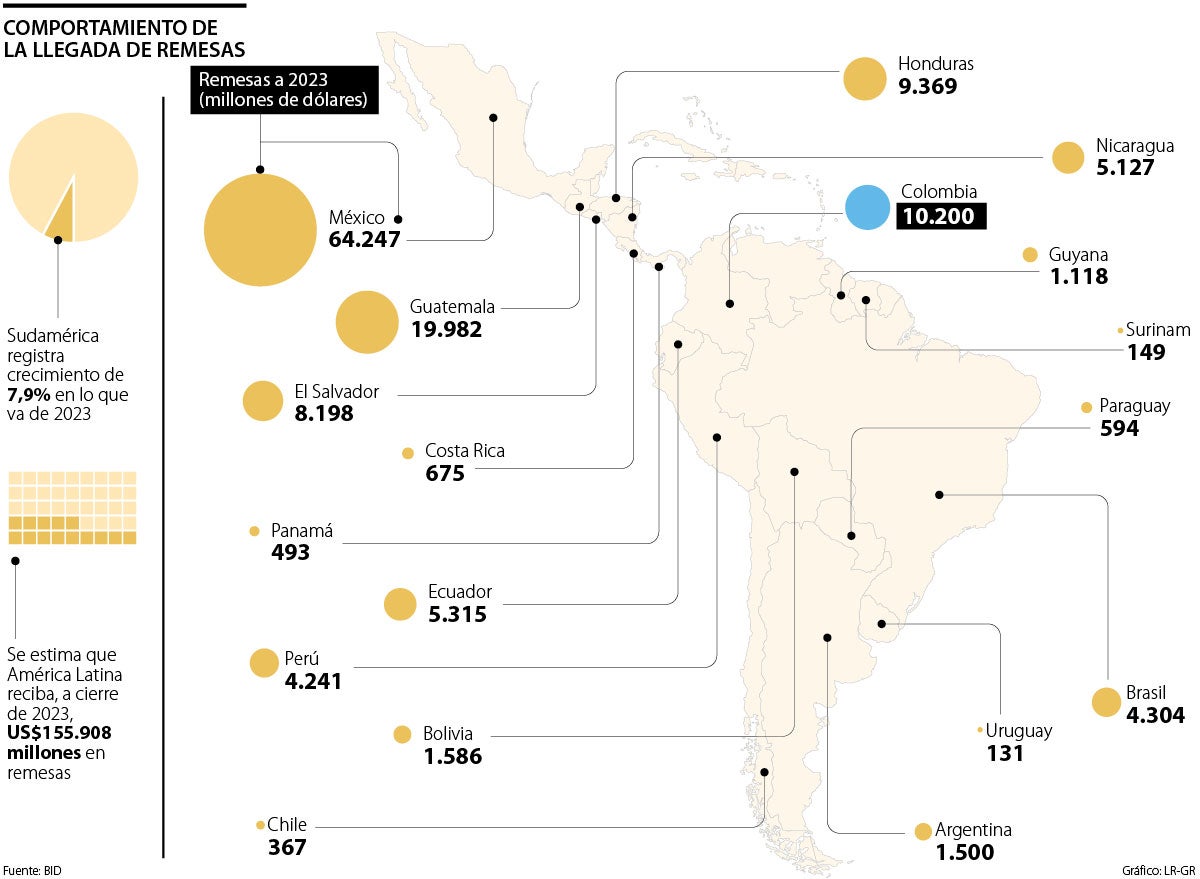 Con este reporte y asumiendo que esta tendencia se mantenga hasta fin de año, el BID indica que este crecimiento esperado implicará un ingreso cercano a US$156.000 millones al cierre de 2023. En 2022, las remesas fueron de US$142.400 millones.