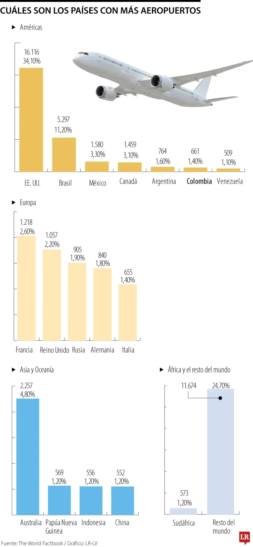 El informe destaca que la presencia de aeropuertos no solo refleja la infraestructura de transporte, sino también la conectividad interna y la capacidad de gestión del tráfico aéreo. En el ranking también están Canadá (1.459); Francia (1.218); Reino Unido (1.059); Rusia (905); Alemania (840); Argentina (764); Colombia (661).
