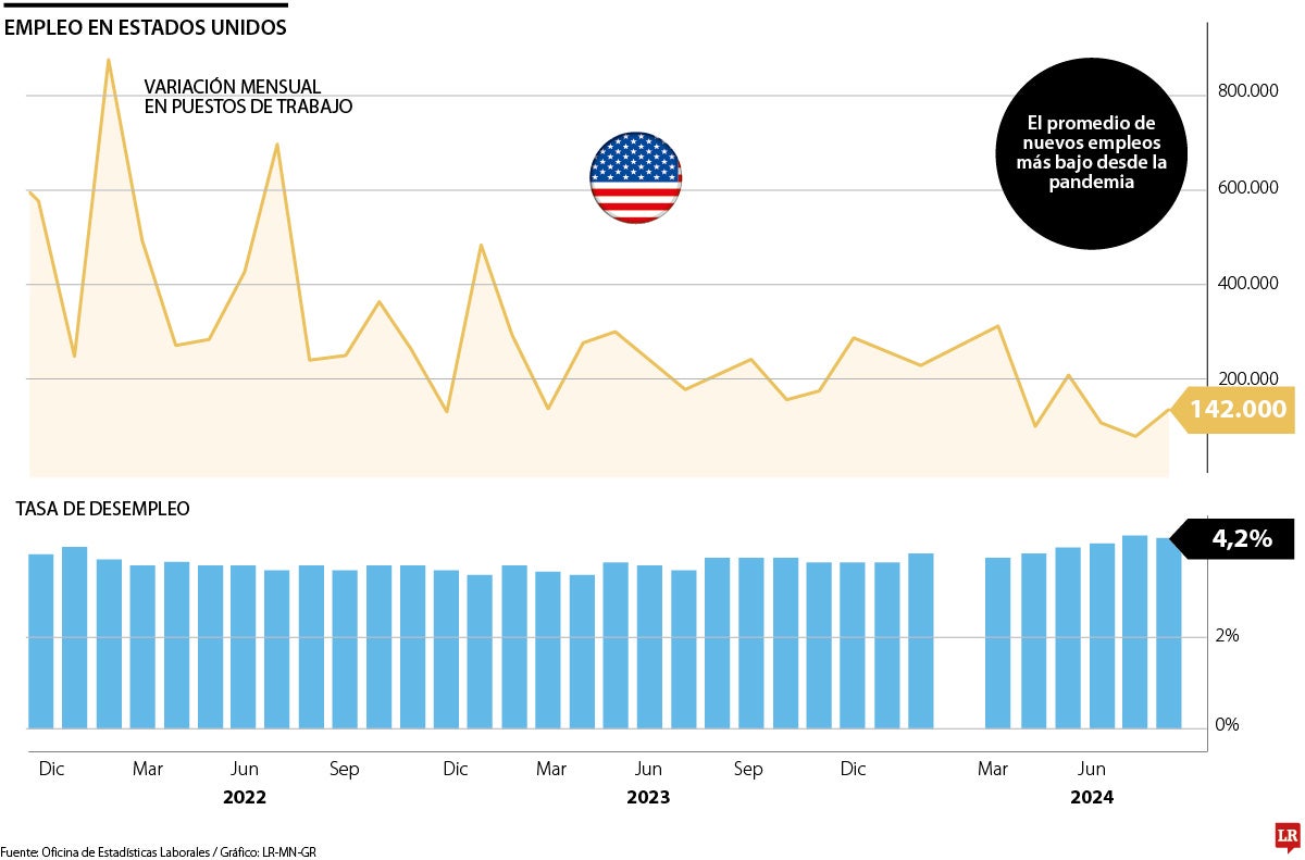 Las nóminas no agrícolas aumentaron en 142.000 el mes pasado, dejando la media de tres meses en el nivel más bajo desde mediados de 2020, según mostraron el viernes los datos de la Oficina de Estadísticas Laborales. La tasa de desempleo bajó hasta 4,2%, el primer descenso en cinco meses, reflejando un cambio de tendencia en los despidos temporales.
