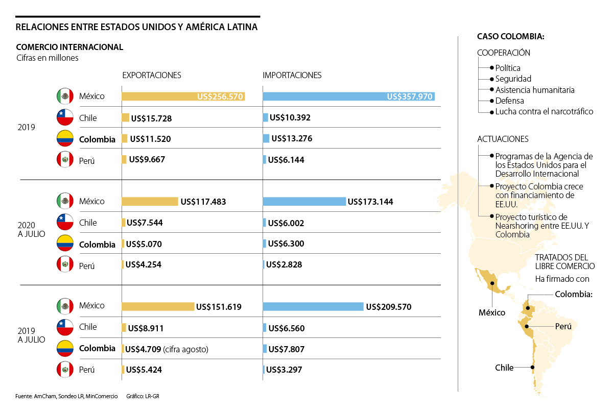 En el caso particular de Colombia, según cifras del Ministerio de Comercio (Mincomercio), las exportaciones a Estados Unidos sumaron US$11.520,2 millones en 2019; lo que representó 29,2% del total de exportaciones de bienes que el país hizo al mundo. Las importaciones cerraron con US$13.276,8 millones, cifra que representó 25,2% de las compras totales que realizó Colombia durante 2019.