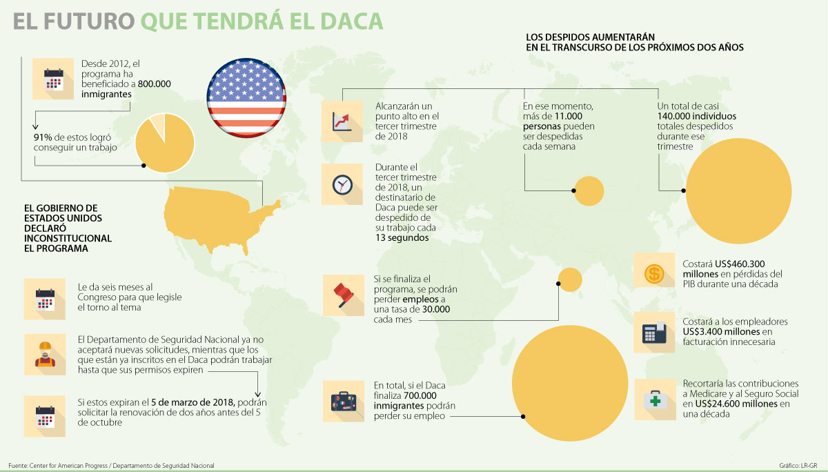 En ese momento, más de 11.000 personas podrán ser despedidas cada semana para dar un total de casi 140.000 individuos que serán sacados de su trabajo durante ese trimestre. Un miembro del Daca, en ese punto, podrá perder su empleo cada 13 segundos, según los cálculos que presentó en su informe el Center for American Progress.