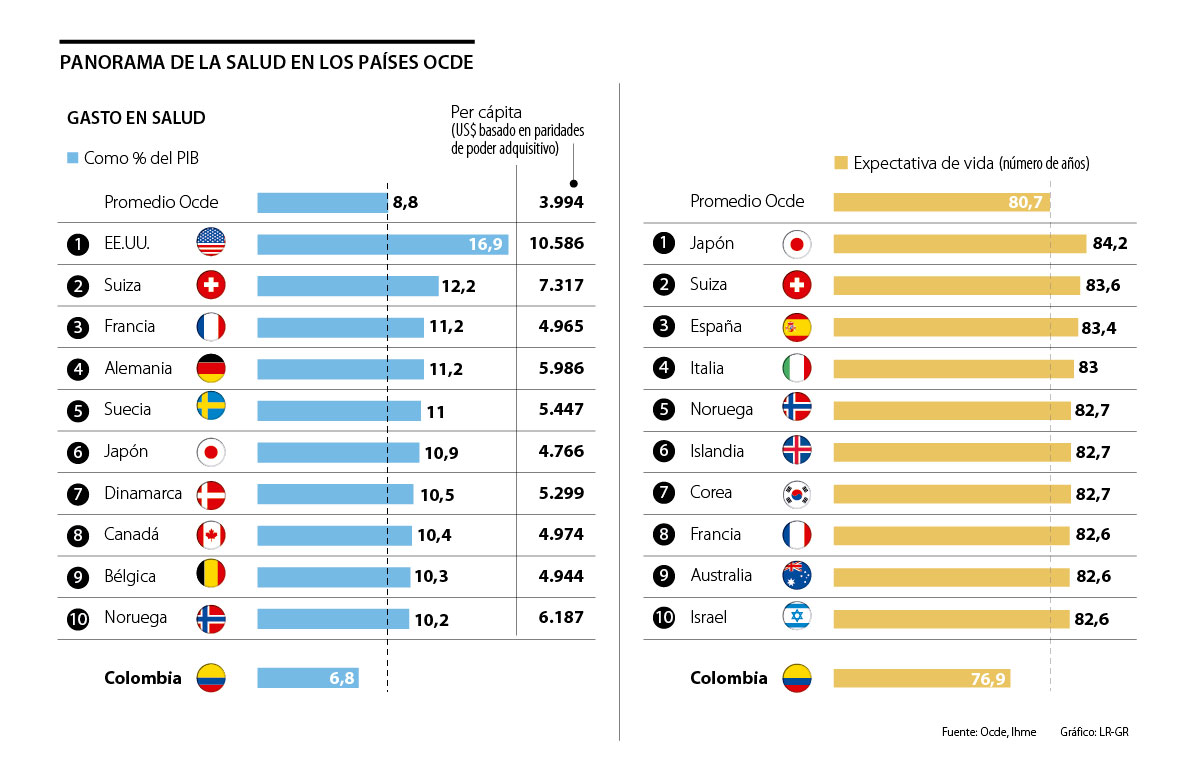 Si bien Colombia ya hace parte de la Ocde, no alcanzó a entrar en el estudio, sin embargo, en promedio, los gastos en salud de representan 6,8% de su PIB.