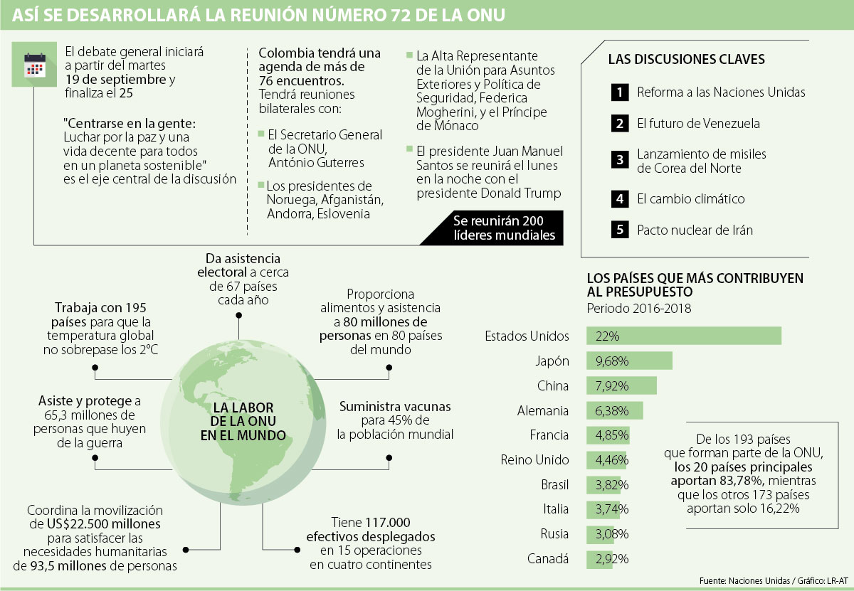 El presidente de Estados Unidos, Donald Trump, llegó a la sesión número 72 de la Asamblea General de las Naciones Unidas con críticas sobre el organismo internacional. Para el mandatario, es urgente disminuir los trámites burocráticos que le impiden actuar de una manera más eficiente y expuso que hay que hacer un recorte presupuestal de la ayuda que brinda su país, pues es el mayor contribuyente con 22% del presupuesto básico que percibe la ONU y que llega a US$5.400 millones.