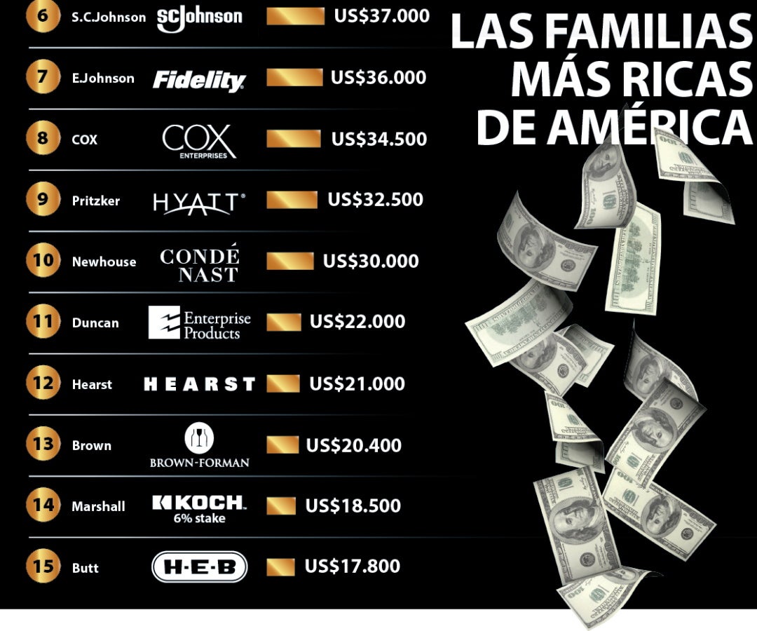 En el quinto puesta está la familia Koch (US$148.500 millones). Los hermanos Frederick, Charles, David y William heredaron la petrolera de su padre Fred. Una disputa fraternal por el control de la empresa a principios de la década de 1980 llevó a Frederick y William a abandonar el negocio, mientras que Charles y David se quedaron. La empresa creció hasta ser Koch, conglomerado de ingresos anuales de US$125.000 millones.