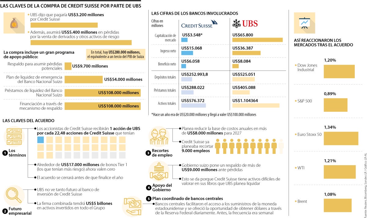 La primera fusión de dos bancos considerados sistémicamente importantes, desde la crisis financiera hace casi 15 años, se realizó en cuestión de días. UBS pagará más de US$3.000 millones por Credit Suisse, una fracción del valor de mercado de la compañía suiza que en sus mejores momentos llegó a tocar los US$100.000 millones.