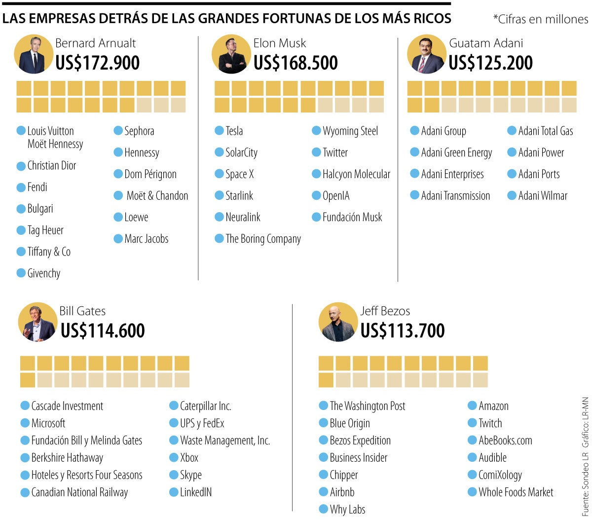 En el caso de Elon Musk, que tiene un patrimonio de US$168.500 millones, las empresa que lo han catapultado a ser uno de los más ricos se encuentran Tesla, especializada en automóviles eléctricos y autónomos; SolarCity, principal proveedor estadounidense de paneles solares de Estados Unidos; Space X, empresa aeroespacial; y Starlink, que ofrece servicios de Internet por satélite en baja órbita.