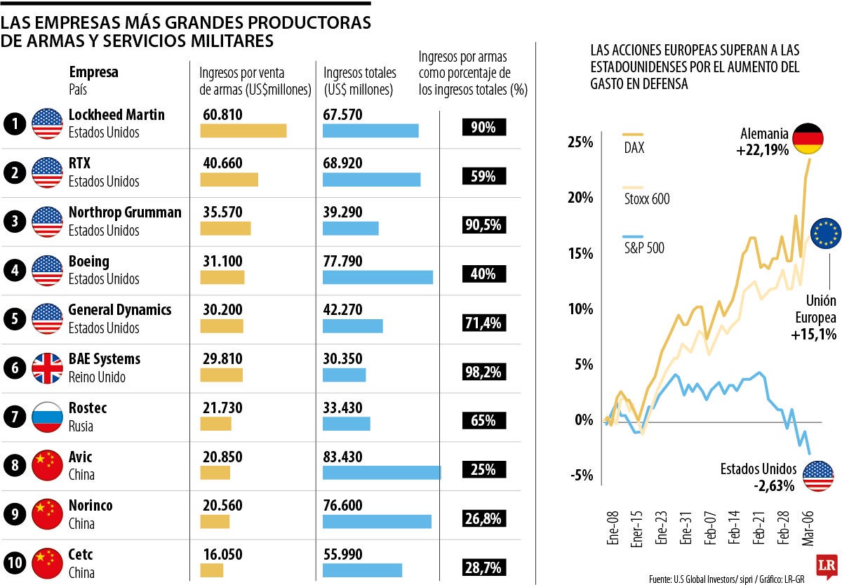 Cifras de Sipri arrojan que empresas como Lockheed Martin y RTX, ambas de Estados Unidos, son las que tiene más ingresos por ventas de armas, con US$60.810 y US$40.660 millones, respectivamente. Northrop Grumman, Boeing y General Dynamics siguen en el listado con US$35.570, US$31.100 y US$30.200 millones.