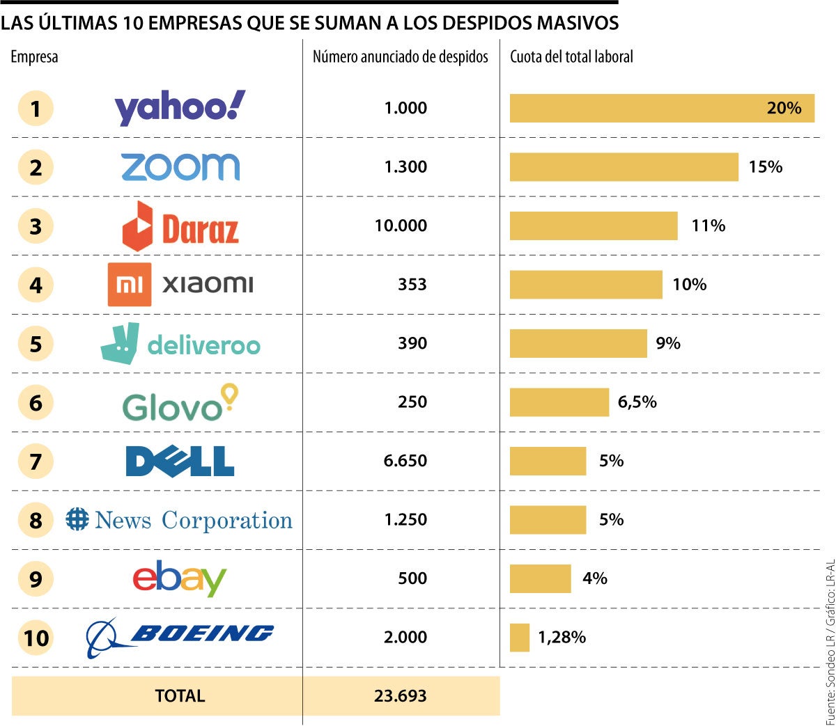 El grupo de las 10 lo cierra eBay, con 500 despidos (4%) y la fabricante de aviones Boeing, con 2.000 (1,28%).