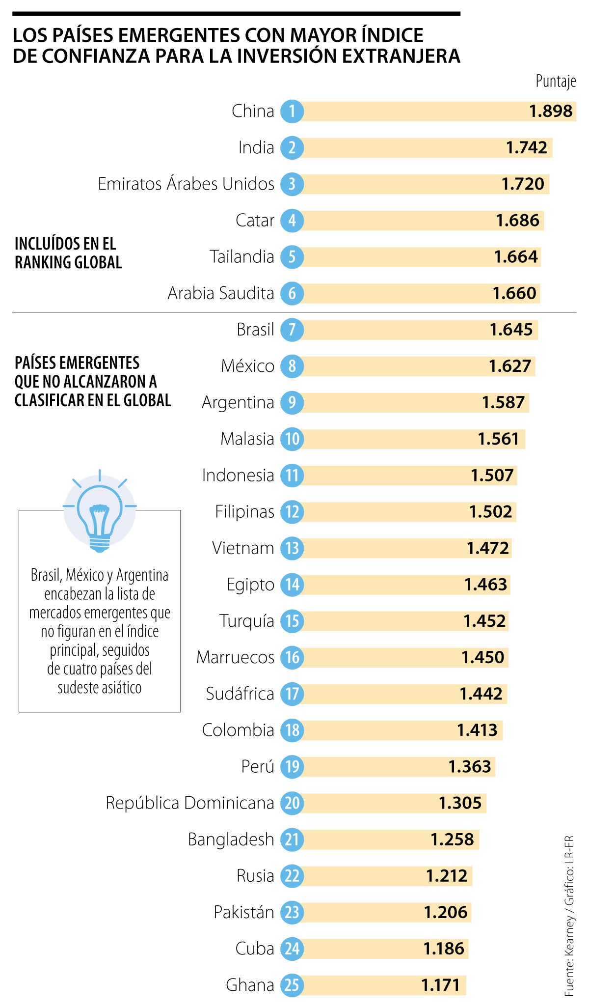 En el ranking, que evalúa a las 25 economías con mayor índice de confianza para la inversión extranjera, ninguno de los países emergentes figuran, si lo hacen, es fuera de la clasificación oficial. Sin embargo, esta vez, la firma decidió incluir una separata con solo emergentes. Allí, China encabeza el listado; mientras que dentro de este, Brasil es el primer latino en aparecer y Colombia, solo figura hasta la casilla 18 de países desarrollados.