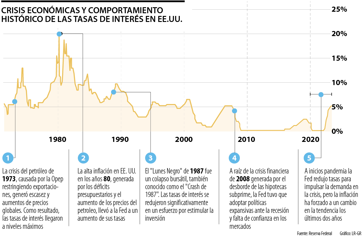 Esta no sería la primera vez que la Reserva Federal tiene que hacer un movimiento de tasas sostenido para contener una crisis económica. Lo cierto es que en las últimas cuarto décadas, también tuvo que hacer 18 subidas seguidas en 2006 y otras 15 durante 1989. LR realizó un recuento de cinco eventos económicos que influyeron en la decisión.