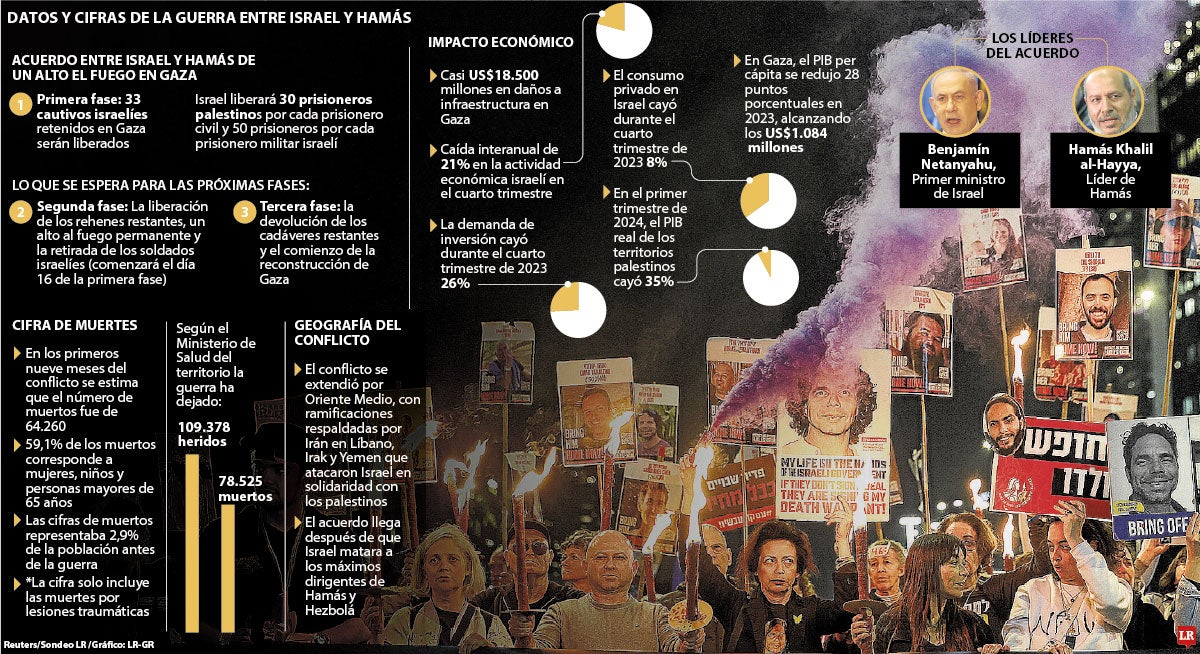 Luego de 15 meses de conflicto entre Israel y Hamás, las partes implicadas alcanzaron un acuerdo de cese al fuego para poner, al menos de forma temporal, un fin a una guerra que han tenido repercusiones económicas de US$18.500 millones y pérdidas humanas que se cuentan en más de 78.520 muertes.