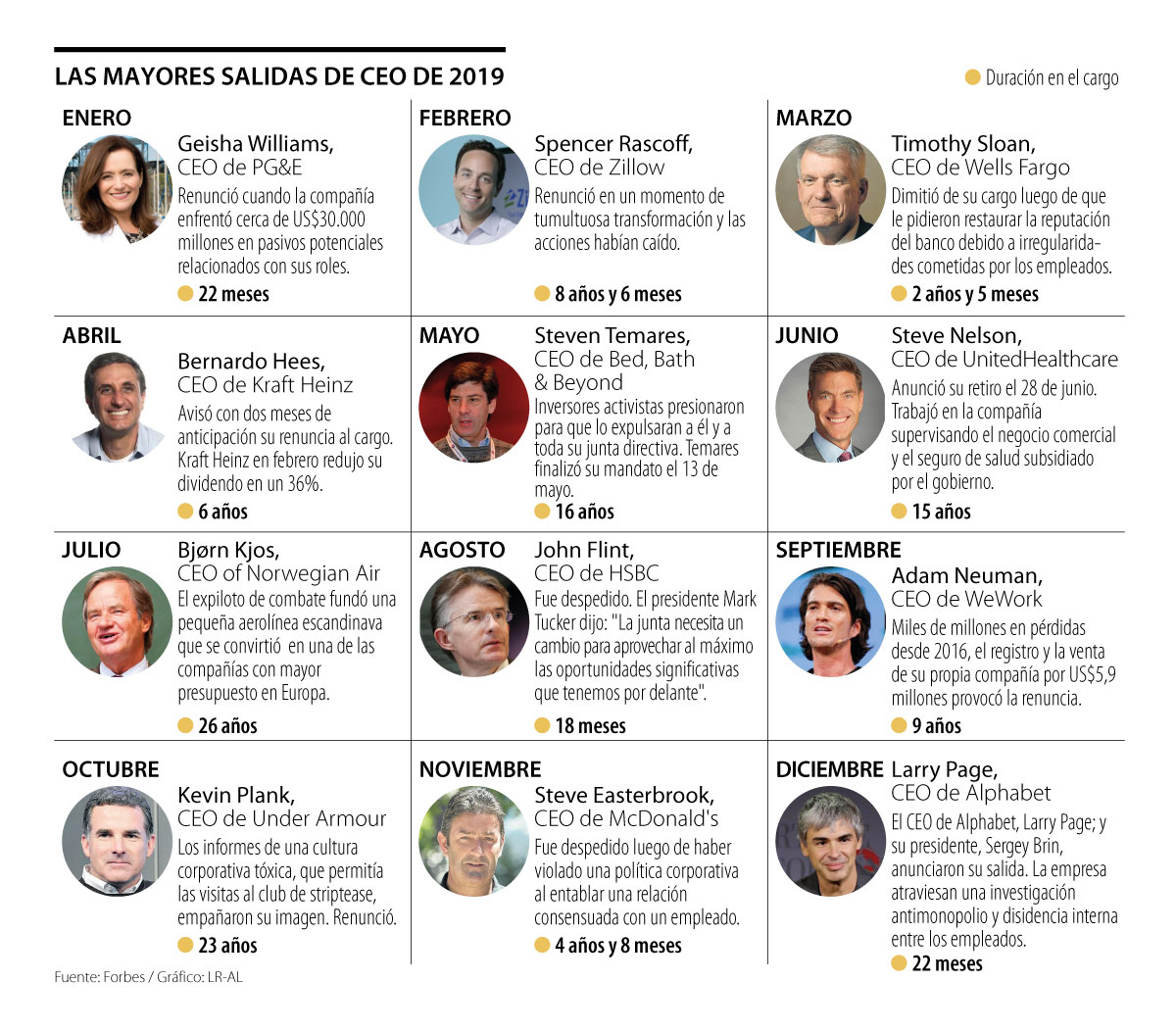 Casi 40% de los directores ejecutivos de las compañías con las mayores capitalizaciones en el mercado duran entre uno y cinco años en el cargo, según Forbes. Basados en esta estadística, la publicación sacó el listado de las principales renuncias de los líderes de las compañías mundiales en 2019, donde figuran ejecutivos como el CEO de WeWork, Adam Neuman; y el CEO de McDonald’s, Steve Easterbrook, entre otros.