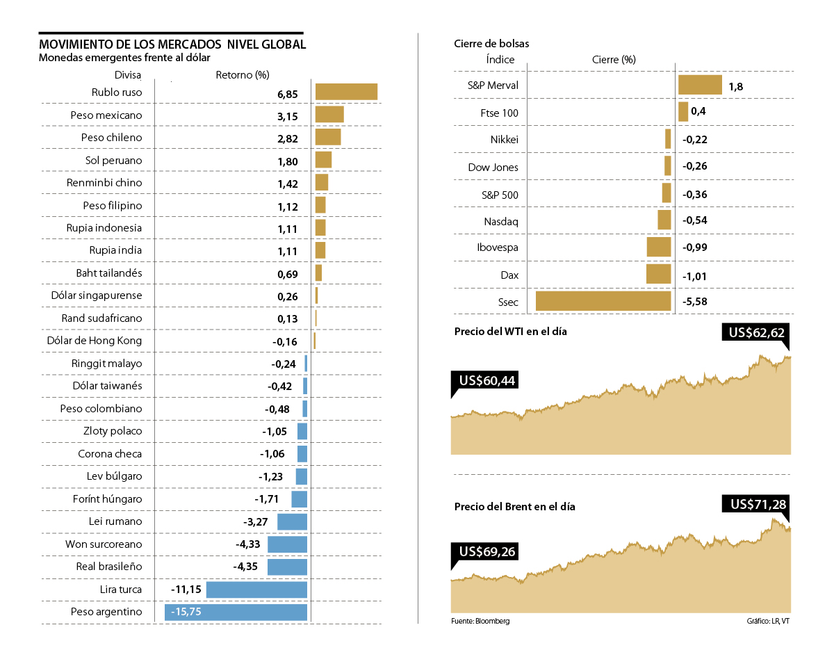 Otro de los efectos que se vio ante la posible llegada de más impuestos a los chinos fueron las monedas de los mercados emergentes, que también sintieron caídas. Este es el caso del peso colombiano, que mostraba una devaluación de 0,48%; el won coreano, que disminuía a un ritmo de 4,33%; el real brasilero, que perdía 4,35%; y el peso argentino, que continúa con su caída, y ayer perdió cerca de 15,74%.