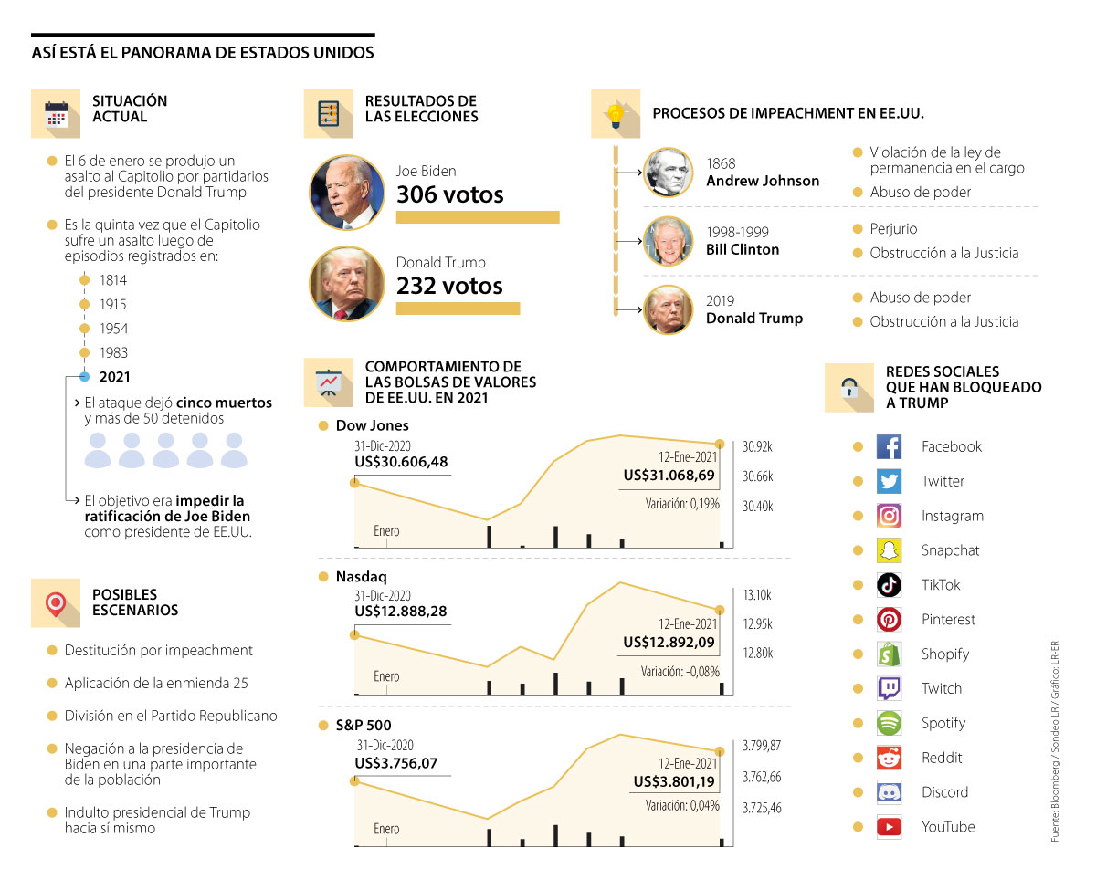 Queda una semana para que Donald Trump abandone la presidencia de los Estados Unidos y regrese a la vida pública como un ciudadano más. Antes de que llegue ese momento, se barajan muchos escenarios que pueden definir su futuro judicial y político en el corto plazo. Sin embargo, las probabilidades de que se concreten son escasas dado el corto margen de tiempo con el que cuentan múltiples actores que no solo incluyen al mandatario, sino al Senado, la Cámara de Representantes y los partidos políticos.
