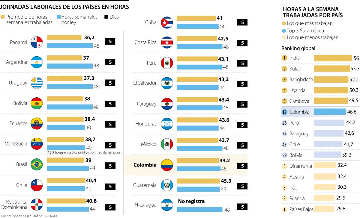 Colombia sigue en la lista con 46 horas en la actualidad, aunque ocupará un lugar más abajo en el ranking a partir de julio. Guatemala tiene 45 horas por ley a la semana para trabajar. A continuación siguen las economías de la región con 44 horas de trabajo: Brasil, Chile, Cuba, República Dominicana, El Salvador, Honduras, Venezuela y Ecuador.