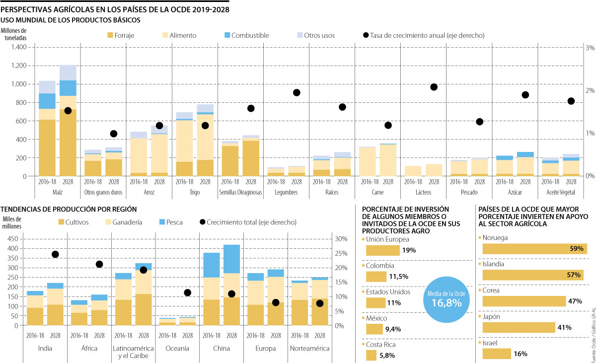 De acuerdo con el estudio de la Ocde, entre 2017 y 2020, la inversión en agricultura de los países miembros fue de US$319.000 millones, de los cuales 72%, que representan cerca de US$231.000 millones, se dieron como apoyo a productores del sector. Dicho apoyo, entregado durante los cuatro años, correspondió a 17,6% de los ingresos agrícolas brutos totales de la zona Ocde, que hasta finales de 2020 fueron de US$708.000 millones.