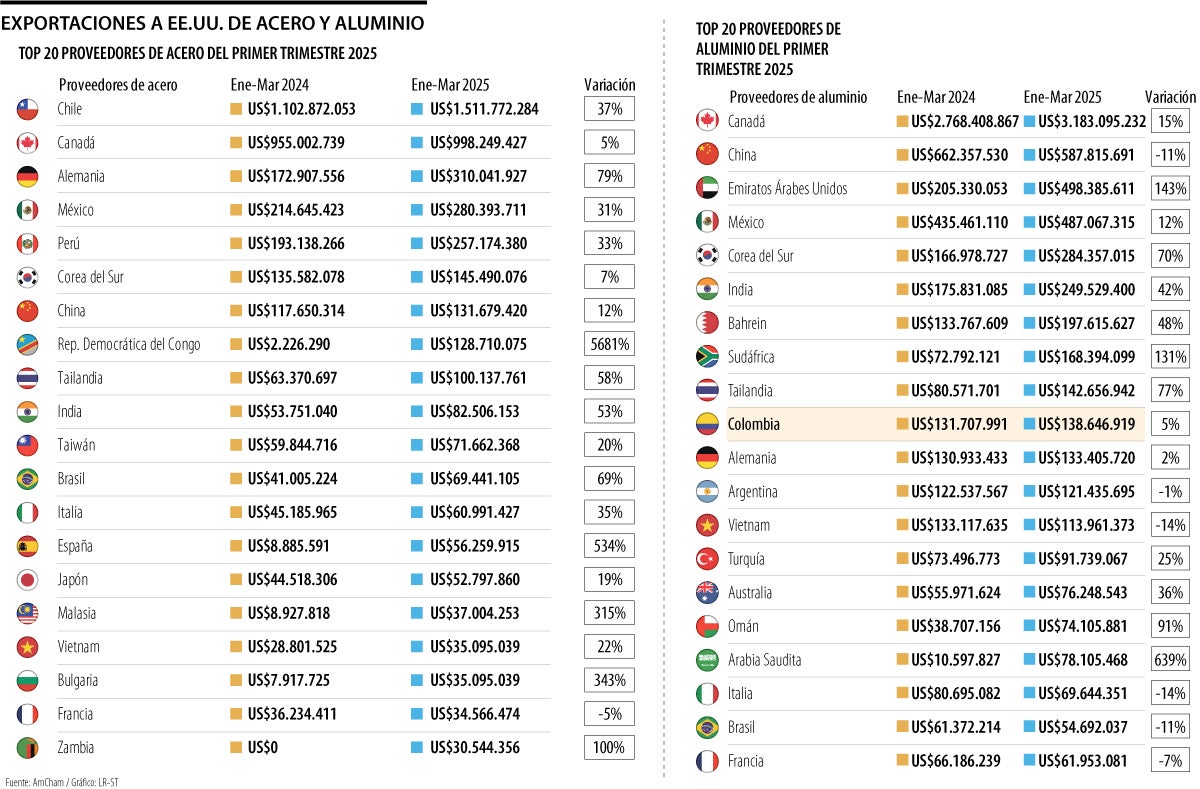 Chile es el principal proveedor con envíos por más de US$1.511 millones en el primer trimestre de 2025, lo que representa un crecimiento de 37% frente al mismo periodo de 2024, según cifras de Amcham. Le siguen Canadá, con US$998,2 millones y un alza moderada de 5%; luego va Alemania con US$310 millones y una variación positiva de 79%; en el cuarto puesto está México, que aportó US$280 millones, incrementando 31% su participación en el mercado estadounidense.
