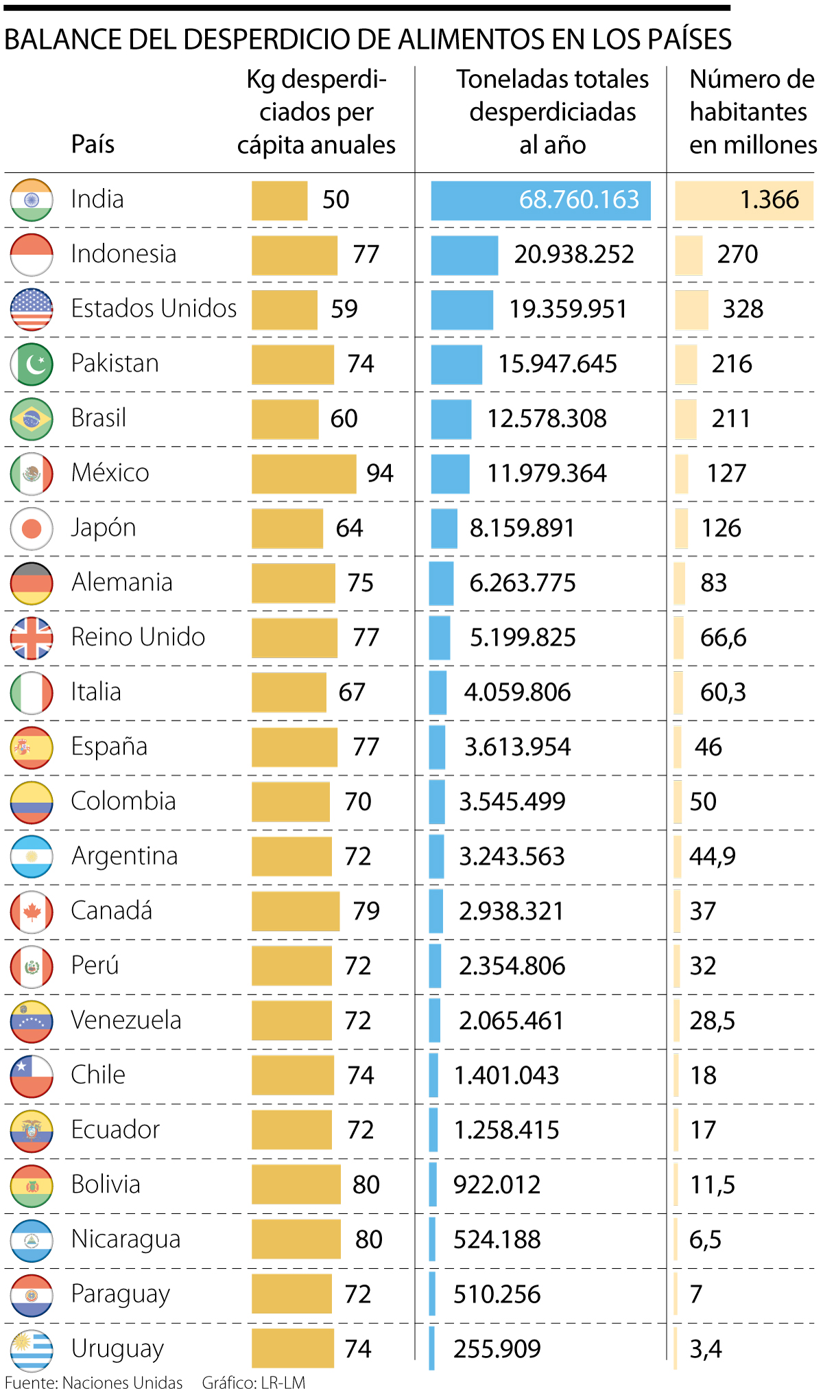 Teniendo en cuenta esto, la cifra por cabeza, con mayores kilogramos de alimento desperdiciado en la región, e incluso en el mundo se la llevó México, pues con 11 millones de toneladas desperdiciadas, el valor per cápita asciende a 94 kilos de alimentos, un hecho similar a la cifra de Brasil, que tiene 12 millones de toneladas desperdiciadas y cerca de 60 kilogramos de desechos, por persona.