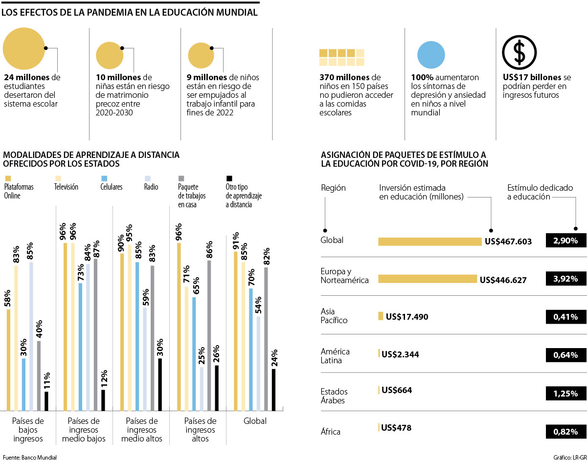 Un reciente informe publicado en conjunto por el Banco Mundial, la Unesco y el Unicef alerta que la actual generación de estudiantes podría llegar a perder unos US$17 billones del total de ingresos que percibirán durante toda su vida, como consecuencia del cierre de las escuelas vinculado con la pandemia de covid-19.