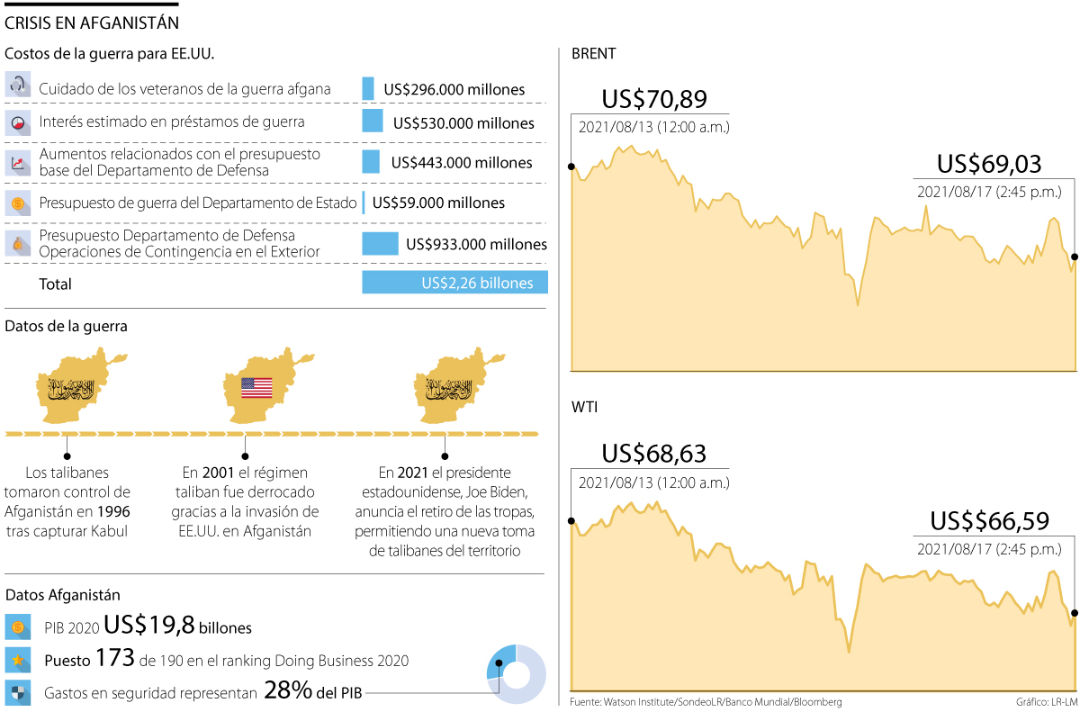 El principal aspecto que podría verse transformado, con el país bajo el mando de los talibanes, es el comportamiento de los precios del petróleo. Esto, pues Afganistán tiene importantes reservas de crudo y gas, al igual que sus vecinos de frontera, Pakistán e Irán, dos de los territorios que contienen las reservas más grandes de crudo y otros minerales en la región de Medio Oriente, y que podrían verse afectados por la inestabilidad que genere la nueva situación política.