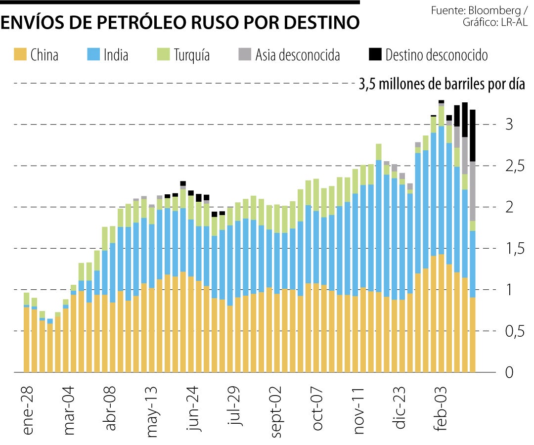 Las exportaciones de crudo por vía marítima de Rusia a países europeos cayeron a 83.000 barriles por día en los 28 días hasta marzo 3, con Bulgaria como único destino europeo. Estas cifras no incluyen envíos a Turkiye.