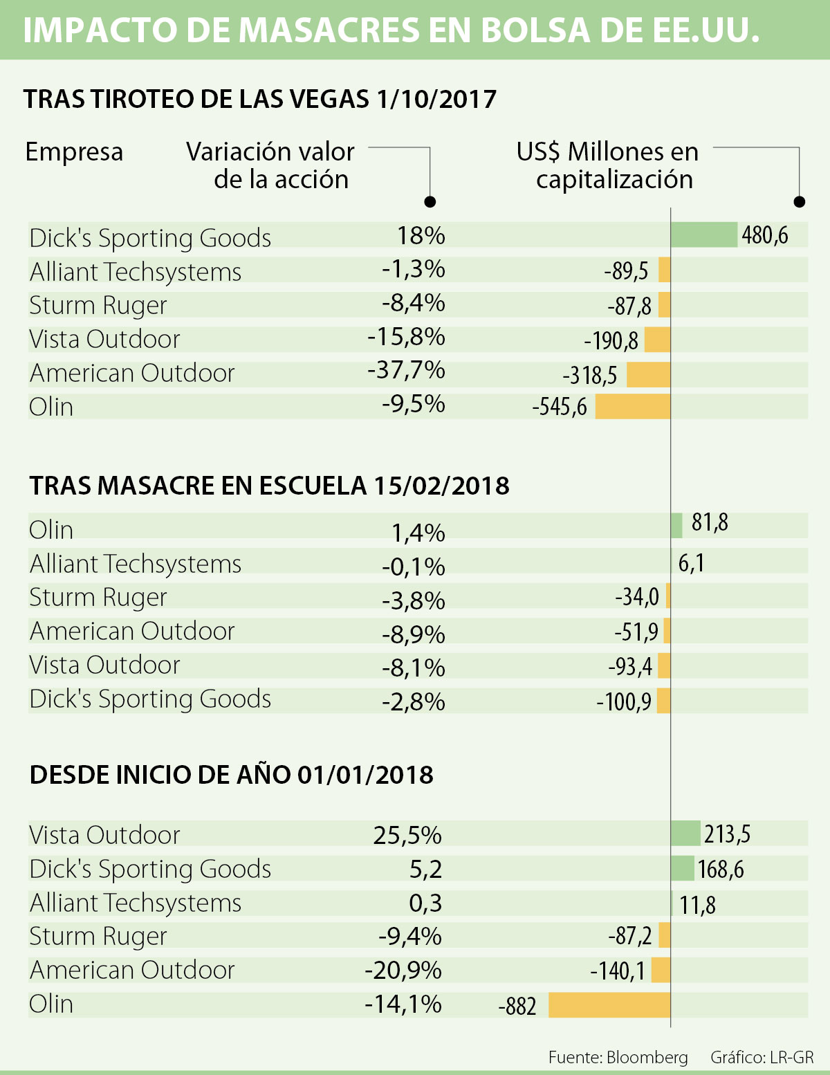 Estos datos concuerdan con las pérdidas que se han generado a raíz de situaciones similares, como sucedió tras el tiroteo de Las Vegas en octubre de 2017 que dejó más de 50 víctimas mortales. Desde ese día hasta esta semana, las principales compañías fabricantes de armas como American Outdoor, Vista Outdoor y Sturm Ruger presentaron variaciones negativas de su capital en la bolsa de -37,7%, -15,8% y -9,5%, respectivamente.