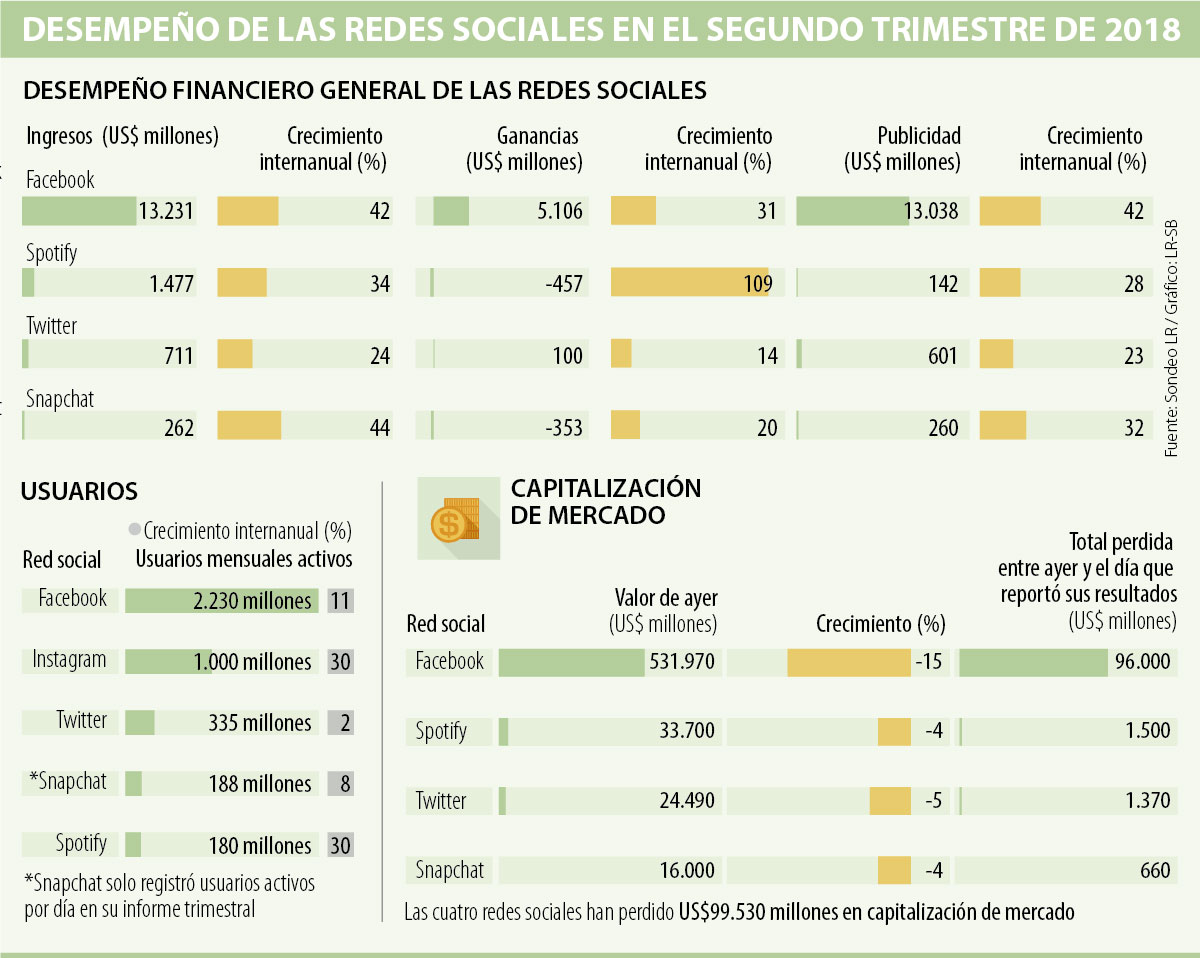 Luego de entregar sus resultados del segundo trimestre del año, el panorama que enfrentan las redes sociales se muestra complejo, pues Facebook, Twitter, Snapchat y Spotify han perdido US$99.530 millones de su capitalización de mercado en las últimas dos semanas. El golpe más fuerte se lo llevó Facebook, pues su valor bursátil se contrajo 15% desde el 25 de julio, cuando presentó sus resultados, aunque aún se mantiene como la más valiosa entre todas las redes sociales con valor de US$531.970 millones.