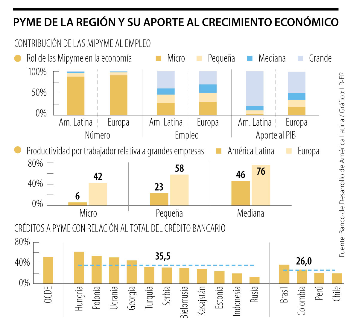 Según Fernando Álvarez, economista senior de la Dirección de Investigaciones Socioeconómicas de la CAF, en América Latina alrededor de 35% del empleo formal lo generan las Pyme, lo que no es algo exclusivo de la región, si se tiene en cuenta que en Europa estas compañías aportan 37% de los puestos de trabajo formales. Sin embargo, al analizar su contribución a la economía como porcentaje del PIB, en América Latina apenas aportan 20%, mientras que en los países europeos proporcionan poco más de 35%.