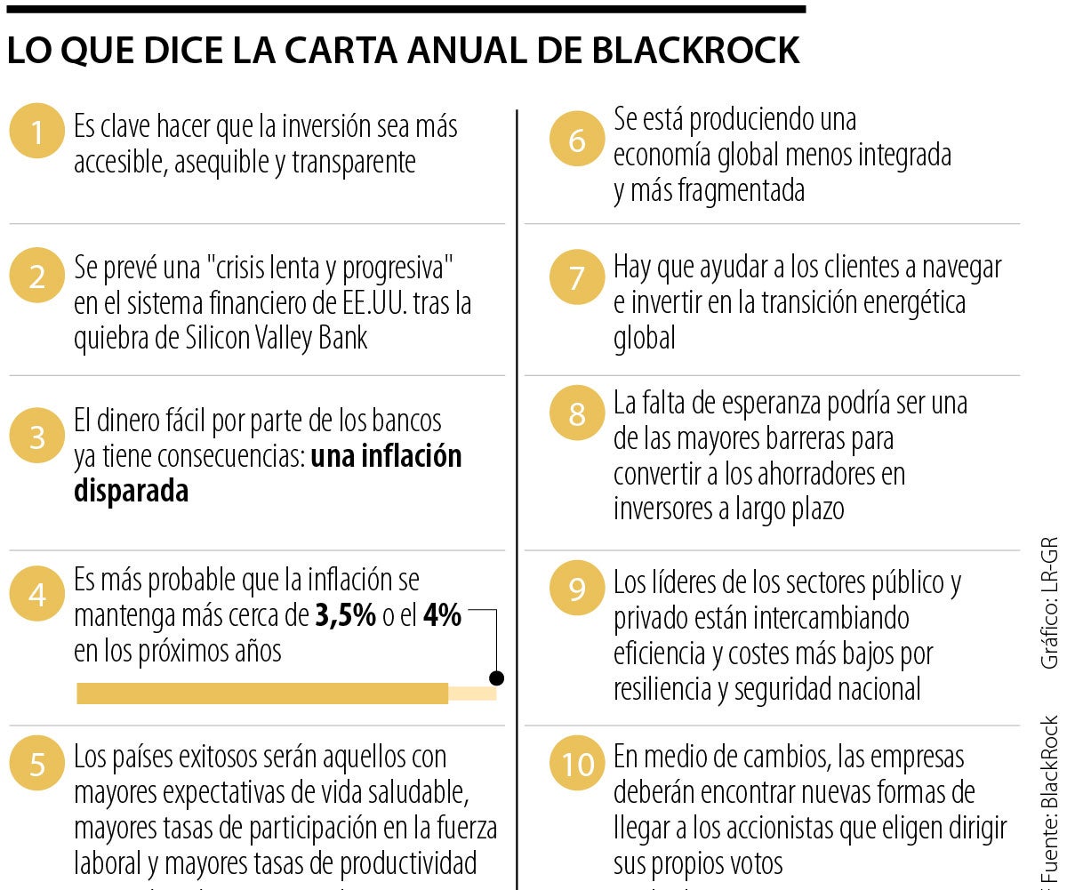 "Aún no sabemos si las consecuencias del dinero fácil y los cambios regulatorios repercutirán en todo el sector bancario regional de EE.UU. con más incautaciones y cierres", escribió. Los bancos inevitablemente retirarán los préstamos, lo que impulsará a más empresas a recurrir a los mercados de capital, creando oportunidades para inversores y administradores de activos, predijo Fink.