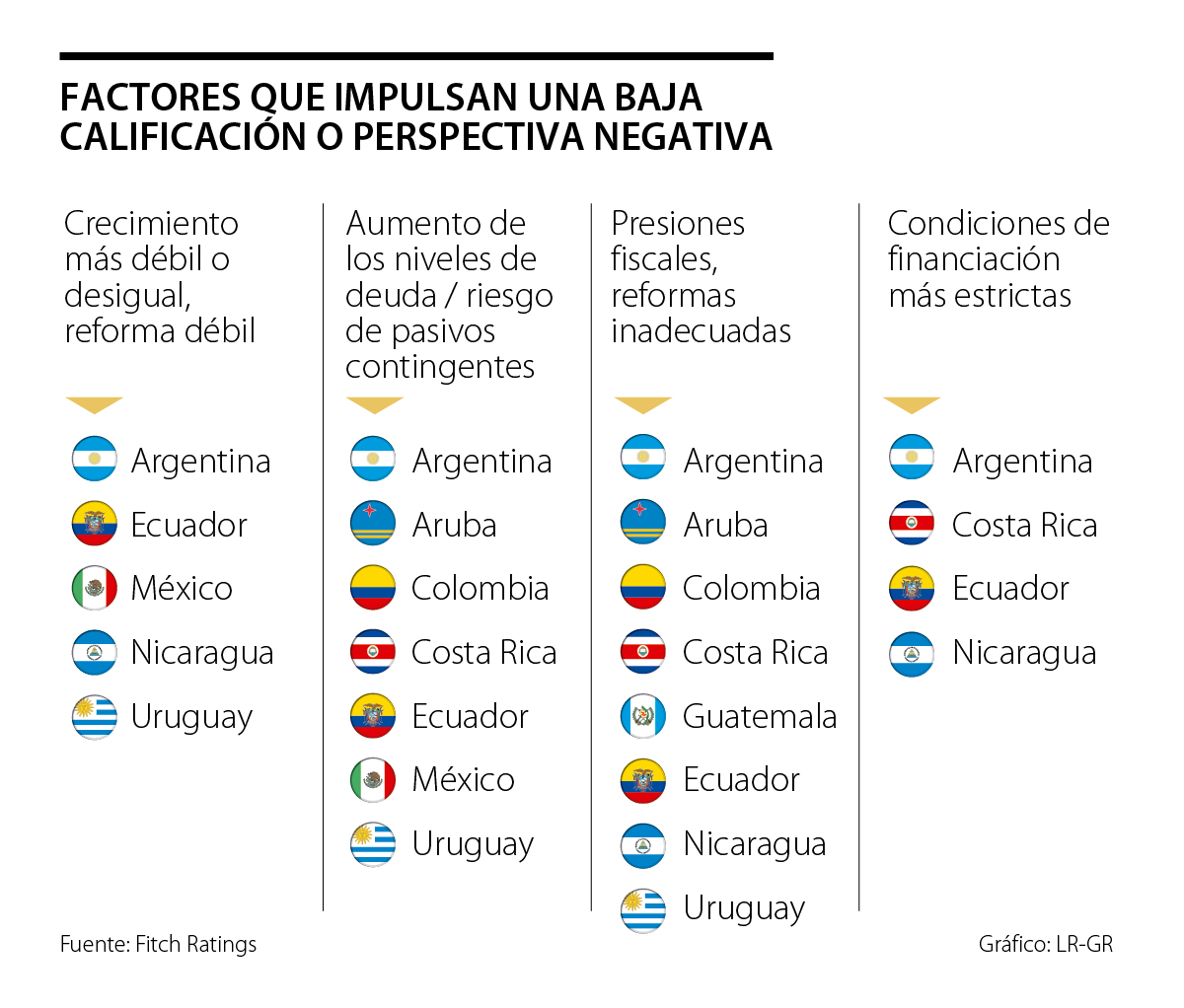 Argentina, Aruba, Colombia, Costa Rica, Ecuador, México y Uruguay fueron las siete naciones mencionadas para el caso de incremento de la deuda como posible razón para una baja de calificación. Sobre estas razones de riesgo, Fitch calificó como “insuficiente” el esfuerzo que se está haciendo para revertir las tendencias al alza en los niveles de deuda en la región.