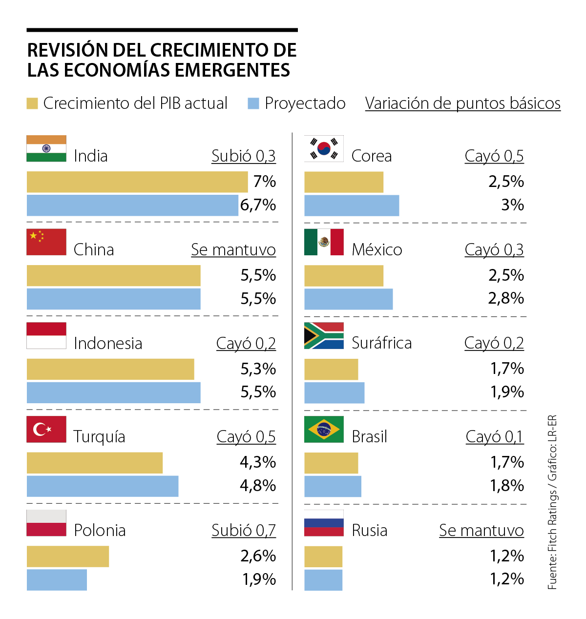En esta oportunidad, el turno fue para la agencia calificadora Fitch Ratings, que con excepción de China y Rusia (cuya proyección se mantuvo) y de Polonia (cuya previsión aumentó en 0,7 puntos básicos), redujo la mayoría de las estimaciones de crecimiento del PIB en las 10 principales economías emergentes.