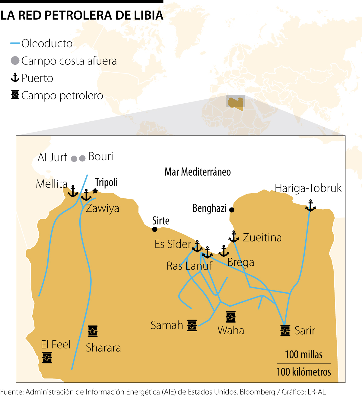 La producción en los campos petroleros de Waha en el este de Libia ha regresado a un nivel normal de 300.000 barriles por día luego de las reparaciones, dijo Ali el-Farsi, portavoz de Waha Oil Co., una subsidiaria de la compañía estatal de energía. El oleoducto de 32 pulgadas puede transportar alrededor de 200.000 barriles de petróleo por día a la terminal de exportación más grande del país en Es Sider, que opera Waha Oil.