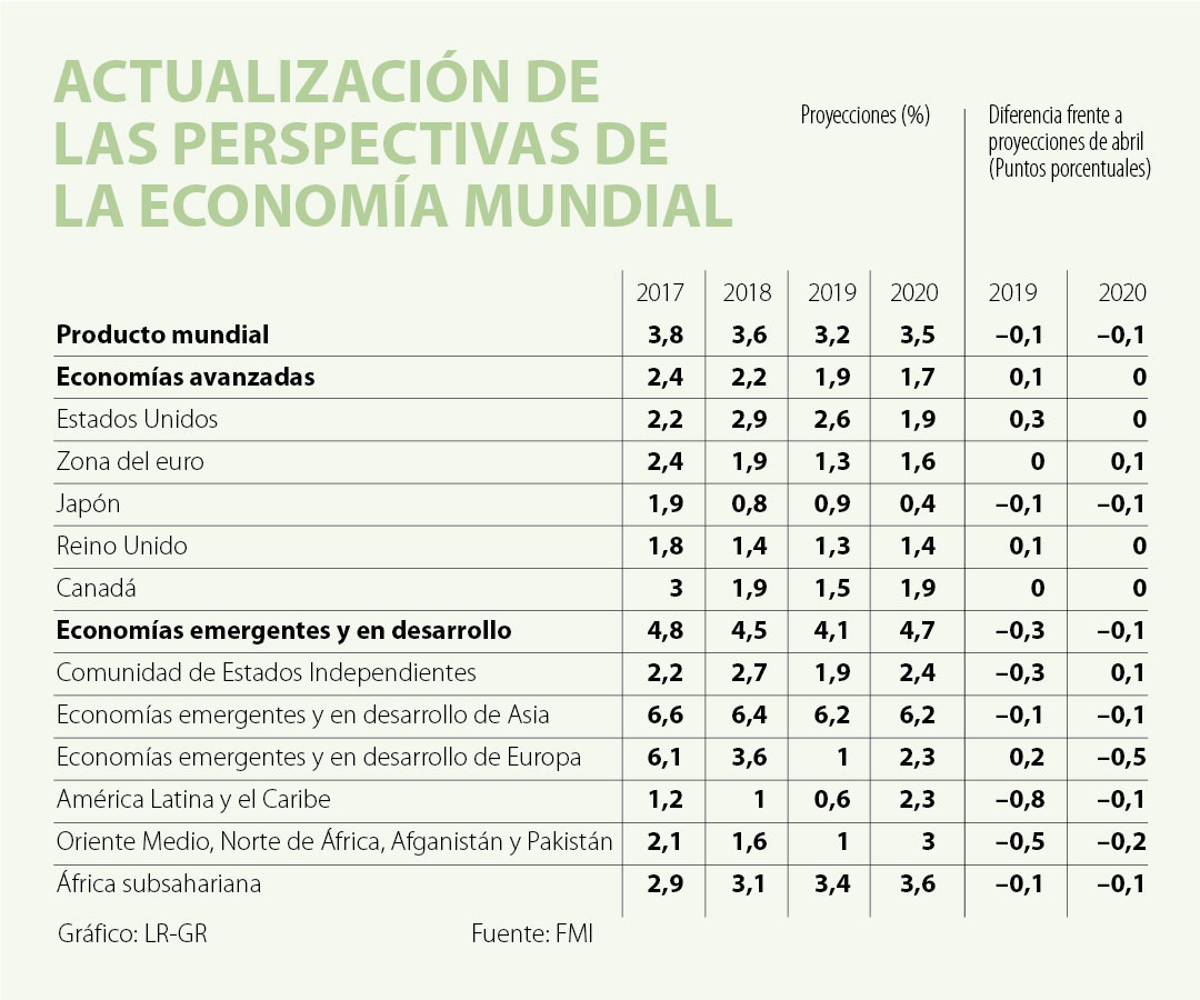 El Fondo Monetario Internacional presentó las actualizaciones de julio de sus perspectivas económicas para este y el próximo año, advirtiendo aún un lento crecimiento de la economía global, ya que, según las proyecciones del FMI, se crecería 3,2% para este año y 3,5% en 2020.