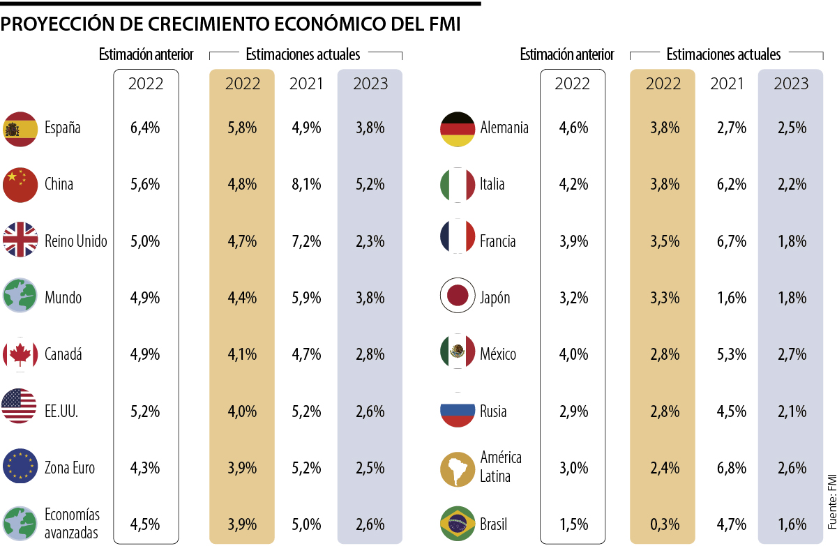 En cuanto a América Latina, el Fondo Monetario también rebajó a 2,4% su proyección de crecimiento en 2022, en comparación con el 3% pronosticado en el anterior informe.
