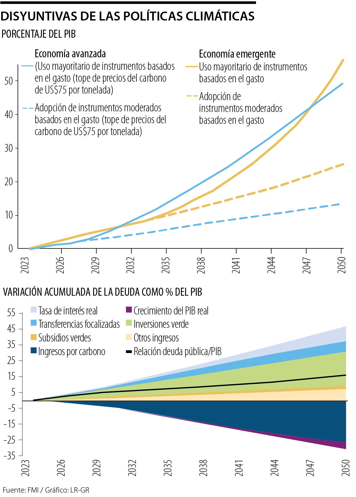 En un documento, el FMI explicó que, “la acción por el clima pone a las autoridades ante complejas disyuntivas”. El costo de recurrir mayormente a las medidas de gasto y de ampliarlas para cumplir los objetivos climáticos será cada vez mayor, y es algo que de aquí hasta mediados de siglo podría elevar la deuda entre 45% y 50% del PIB.